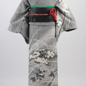 薄い緑色の色無地です。一つ紋がついています。お茶席やお子様の入学式などフォーマルな場でご使用頂けます。